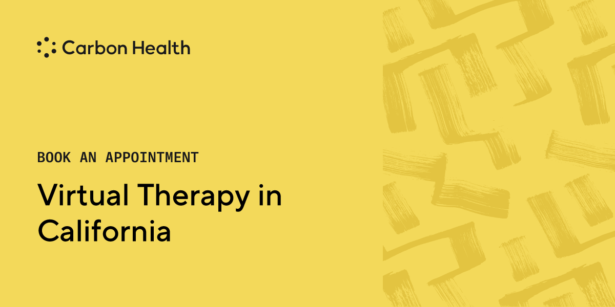 Live in California? Carbon Health therapists are here to help you manage symptoms of anxiety, stress, trauma, sleep and wellness, relationship challenges, and more. Our therapists practice cognitive behavioral therapy and focus on short-term therapy designed for your unique symptoms, needs, and personal preferences. Virtual Therapy sessions for new patients cost $149.